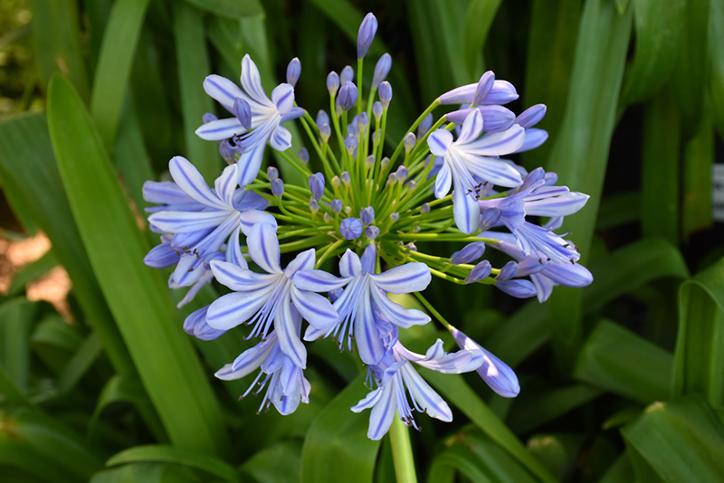 African Lily (Agapanthus) is a perennial that grows 2-4 ft tall, hardy in USDA Zones 8-10, prefers well-drained, rich soil, full sun to part shade, medium moisture, and has no edible or medicinal uses.
