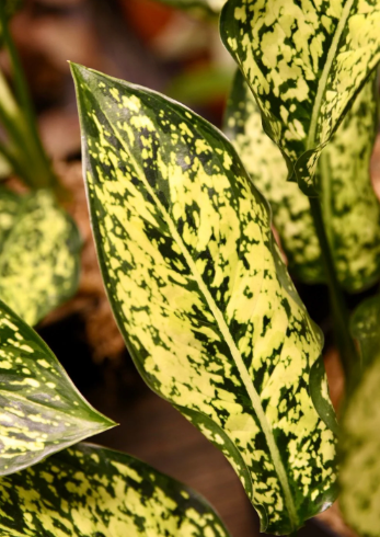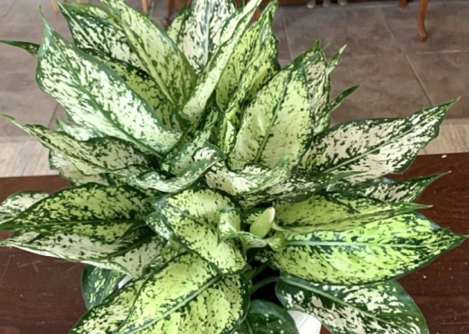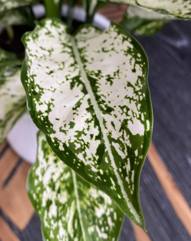 Aglaonema 'First Diamond', a slow-growing Chinese Evergreen, reaches 0.3-0.6 m in low to medium light, with variegated green and white leaves, known for air purification and elegant foliage.
