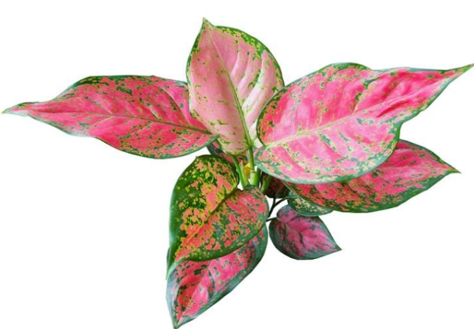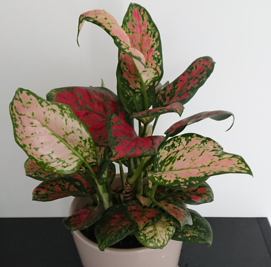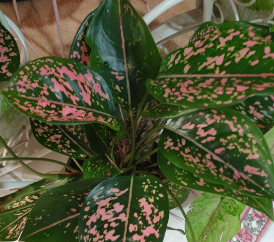 Aglaonema 'Pink Dalmatian', a slow-growing Chinese Evergreen, reaches 0.3-0.45 m in bright indirect light, with dark green leaves splashed with pink spots, known for air purification and vibrant appeal.