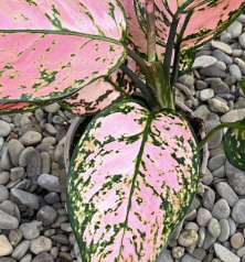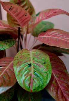 Aglaonema 'Pink Star', a slow-growing Chinese Evergreen, reaches 0.3-0.6 m in bright indirect light, with green leaves and pink splashes, known for air purification and vibrant foliage.