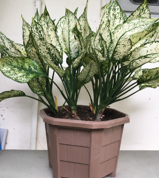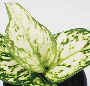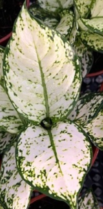Aglaonema 'White Calcite', a slow-growing Chinese Evergreen, reaches 0.3-0.6 m in low to bright indirect light, with lance-shaped dark green leaves and bright white spots, known for air purification.