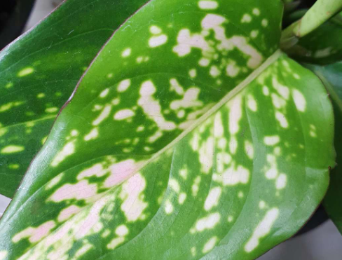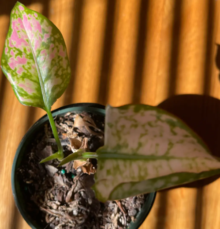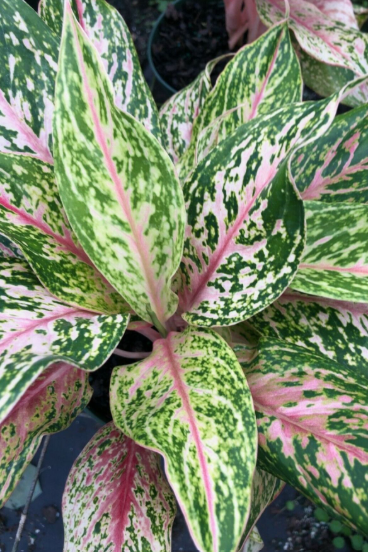 Aglaonema 'Wishes', a slow-growing Chinese Evergreen, reaches 0.3-0.6 m in bright indirect light, with pink and green variegated leaves, known for air purification and colorful foliage.