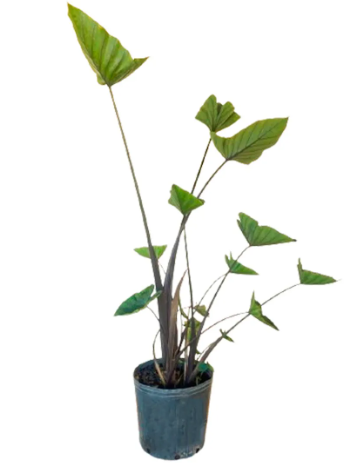 A compact Alocasia hybrid with upward-facing, cup-like glossy leaves, grown as an ornamental houseplant for its unique foliage and air-purifying qualities.