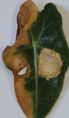 yellowing or drooping leaves, soft or blackened rhizomes, brown or water-soaked leaf spots, leaf curling, leaf edge burn, sticky honeydew, fine webbing and speckling.