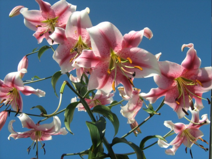 Anastasia (Lilium 'Anastasia'), a moderately growing Orienpet lily hybrid, grows 1.5-2.1 m in fertile soil under full sun to part shade, yielding 10-20 fragrant pink-white flowers in mid to late summer with no edible or medicinal use.