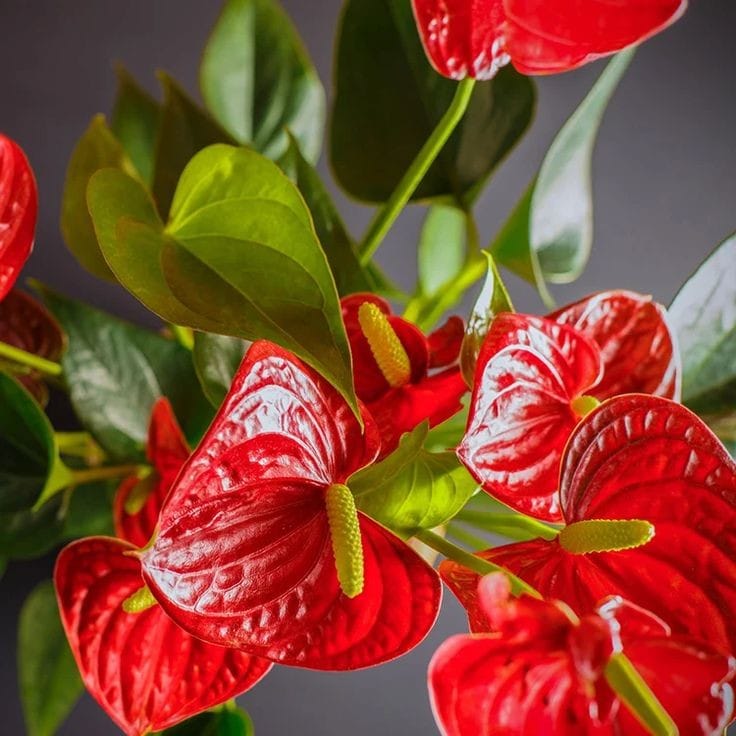 This is the most common type, known for its heart-shaped, glossy leaves and colourful spathes. It comes in various shades of red, pink, white, and even green.
