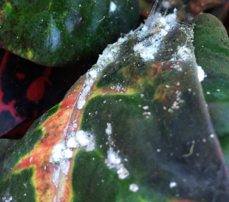 Dark, sunken lesions on leaves and stems, White powdery coating on leaves, Wilting with mushy roots, Dark spots with yellow halos on leaves, Small, waxy insects with sticky residue.