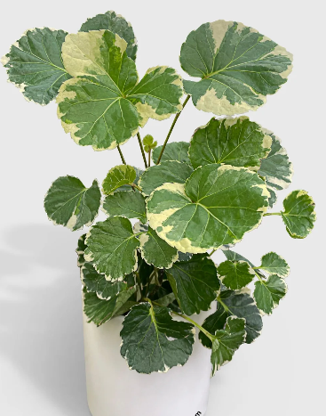 Evergreen shrub to 3 m, Aralia Big Leaf (Fatsia japonica) features large, glossy, hand-shaped leaves, thriving in shade. Native to Japan, it blooms white in autumn-winter, ideal for shaded gardens or indoors. Non-edible, it purifies air with potential medicinal properties.