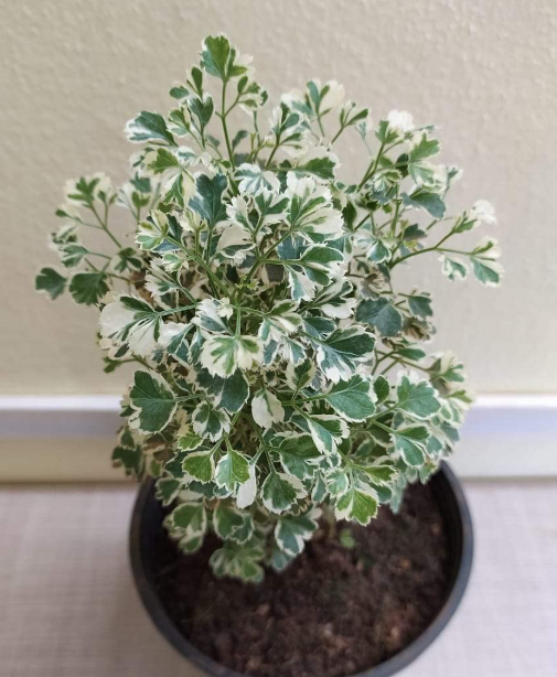 Evergreen shrub to 1.2 m, Aralia Ice Ball (Polyscias ‘Snow Ball’) has variegated white-green round leaves, suited for indoor bright light. Tropical Asian origin, it’s low-maintenance, non-edible, and purifies air. Ideal for humid interiors like bathrooms.