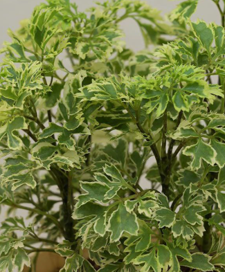 Aralia Snow Ball, a compact indoor shrub, features delicate, variegated white-green leaves. Ideal for tabletops, it purifies air and adds elegance to living spaces.