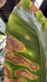yellowing or wilting leaves, soft or blackened roots, brown or water-soaked leaf spots, leaf tip burn, sticky honeydew, cottony white masses, fine webbing and speckling