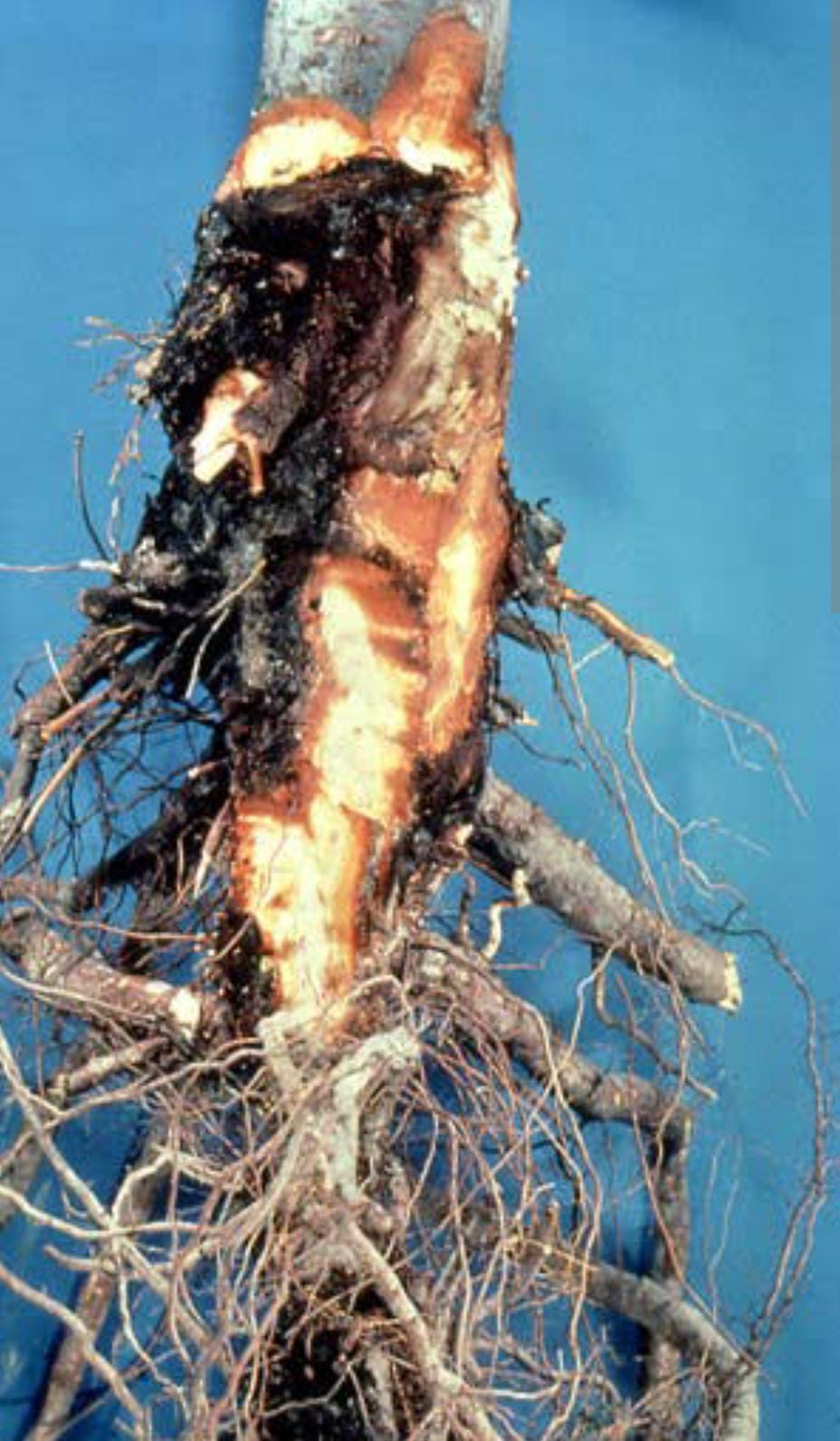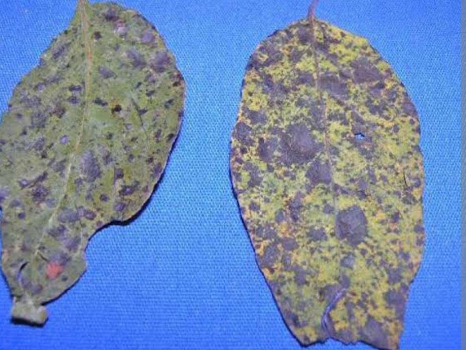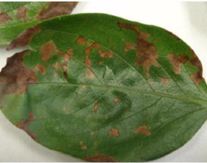 Small, dark brown spots on both leaf surfaces., leaves change colors and fall from the tree, the branches and twigs die, and eventually the entire tree fails.