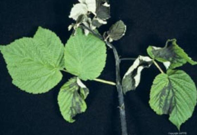 leaf symptoms most evident during cool weather, can range from puckering, curling and crinkling, diseased plant parts become purplish black.
