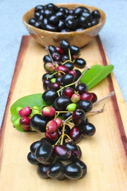 Syzygium cumini, commonly known as black plum, is a fast-growing, attractive evergreen shrub or tree with a dense crown of leaves. The flowers are greenish-white. The fruit is elongated and black, juicy and shiny when fully ripe.