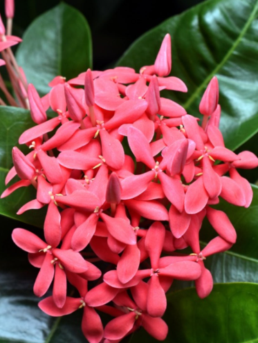 Blushing Bride (Ixora 'Blushing Bride'), a dwarf tropical evergreen hybrid shrub, grows 0.6-1.2 m with slow growth in well-drained acidic soil, thrives in full sun to partial shade with moderate to high moisture, is non-edible with no medicinal benefits, and produces soft pink flower clusters year-round.