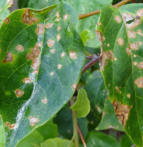white powdery growth on leaves, yellowing or dropping foliage, brown or black leaf spots, leaf scorch, wilting from root decay, distorted new growth, sticky honeydew and fine webbing