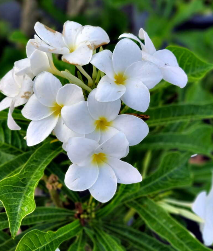Bridal Bouquet (Plumeria pudica 'Bridal Bouquet'), an evergreen tropical shrub, grows 1.2-2.4 m with moderate growth in well-drained sandy soil, thrives in full sun with moderate moisture, is non-edible with no medicinal benefits, and produces white flowers with yellow centers and fiddle-shaped leaves year-round in tropics.