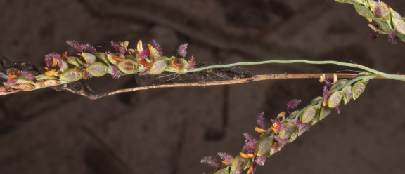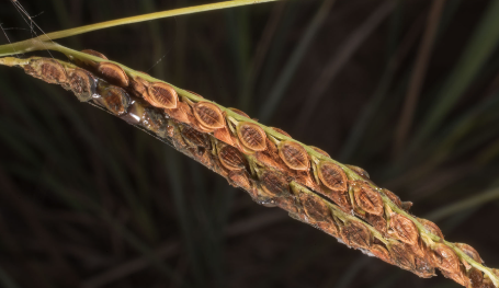 Brownseed Paspalum (Paspalum plicatulum) grows up to 4 ft, thrives in sandy soil, full sun, moderate moisture, and is neither edible nor medicinal.