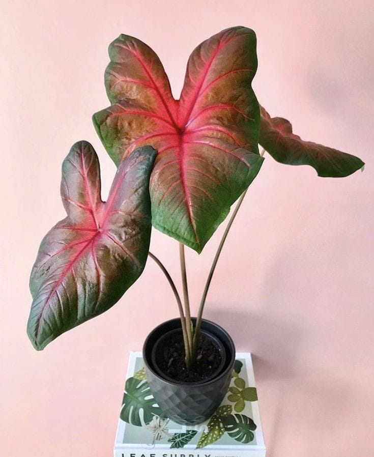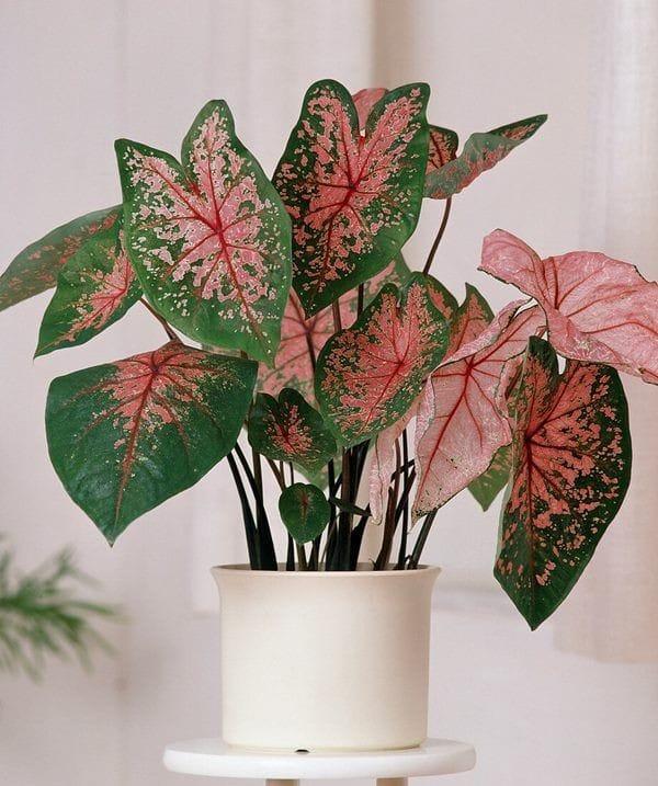 Caladium is a tropical perennial with colourful heart-shaped leaves that grows naturally in the tropical forests of Central and South America, where there are distinct rainy and dry seasons. Caladium bicolor, a Brazilian species, is the most common of several species of this genus in the Araceae family used as an ornamental plant.