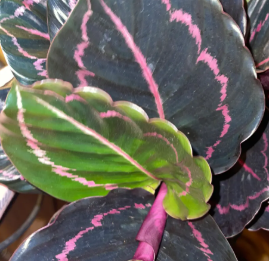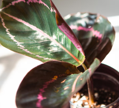 A medium-sized decorative houseplant thriving in partial shade with high moisture needs, known for its dark, striking leaves with pink markings. |