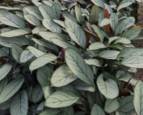 Calathea 'Silver Stripe', a slow-growing tropical hybrid, reaches 0.3-0.6 m in bright indirect light, with green leaves and silver stripes, requiring high humidity for air purification.