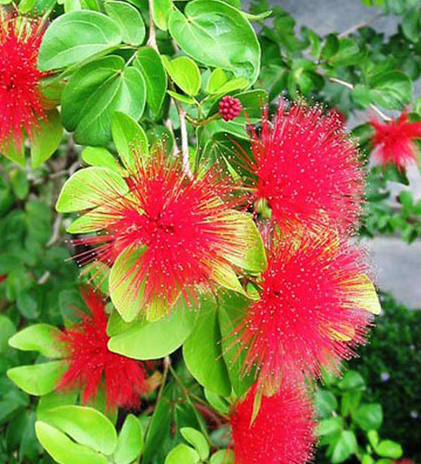 A fast-growing ornamental shrub with bright red powder puff flowers, thriving in full sun and moderate moisture, suitable for landscaping. |