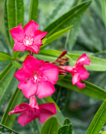 Calypso (Nerium oleander 'Calypso'), a Mediterranean evergreen shrub, grows 1.8-2.4 m with vigorous growth in well-drained sandy-loam, thrives in full sun with low to moderate moisture, is non-edible and toxic with no medicinal benefits, and produces single cherry red flowers in summer.