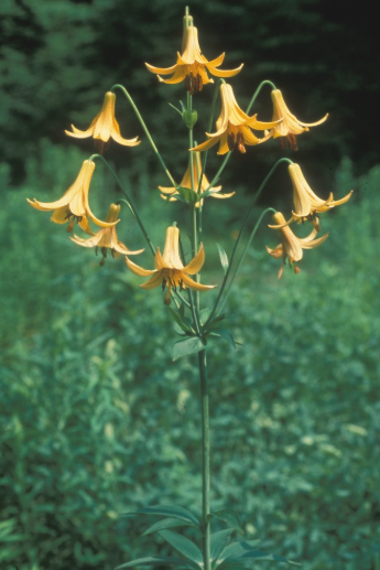 Canada Lily (Lilium canadense), a moderately growing Eastern North American perennial, reaches 0.9-1.8 m in moist, well-drained soil under part shade, producing 5-20 yellow-orange flowers in mid-summer with no edible or medicinal value.