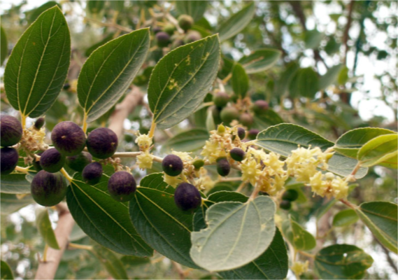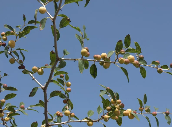Christ's Thorn Jujube (Ziziphus spina-christi) grows up to 15 ft, thrives in well-drained soil, full sun, low moisture, and is both edible and medicinal.