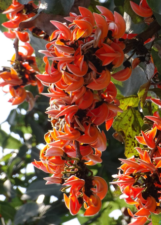 Coastal Palash (Butea monosperma 'Coastal'), a deciduous tree, grows 10-15 m with slow growth in well-drained sandy-loam soil, thrives in full sun with low moisture, is non-edible with medicinal benefits, and produces 2.5 cm orange-red flowers in Feb-Apr.