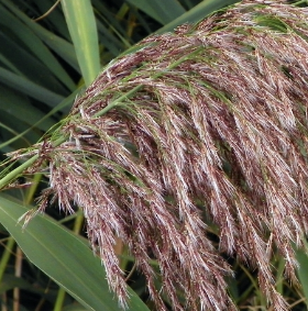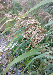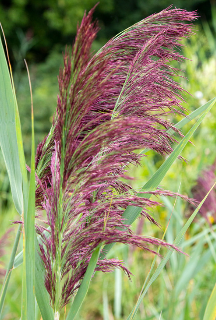 Common Reed (Phragmites australis) grows rapidly up to 13 ft, thrives in wet soil, full sun, high moisture, and is neither edible nor medicinal.
