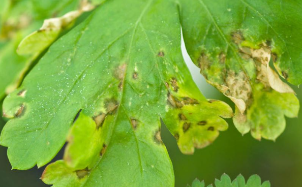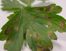 Wilting seedlings, white or gray fuzzy growth on soil, small water-soaked spots turning dark on leaves