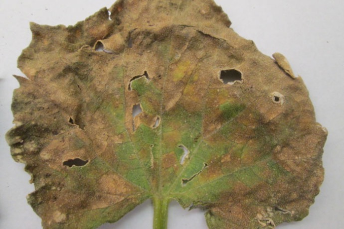 Angular spots on leaves: This bacterial disease causes small, water-soaked spots on the leaves that spread until they touch the larger veins.