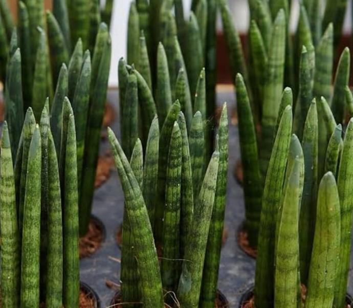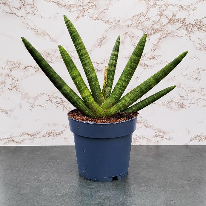 This unique type of snake plant has upright, succulent, sword-shaped leaves covered with wavy horizontal stripes of light gray-green.