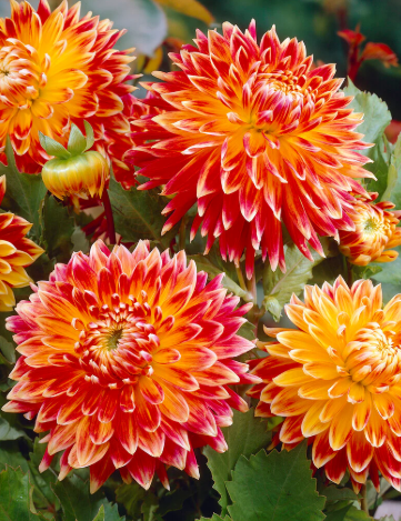 A dramatic, red and white chrysanthemum-like Dahlia with large blooms, perfect for ornamental gardens and edible petals for stress-relieving displays.