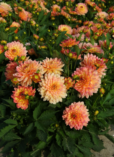 A compact, waterlily-type Dahlia with salmon-pink blooms, ideal for containers and edible petals for aesthetic garden appeal.
