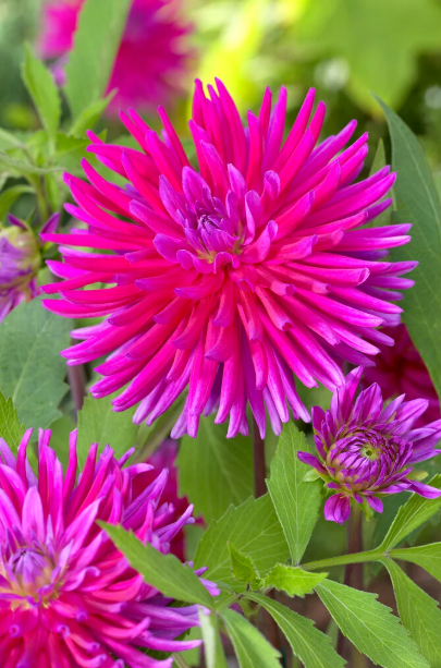 A rich purple, cactus-type Dahlia with spiky blooms, ideal for ornamental gardens and edible petals for stress-relieving displays.