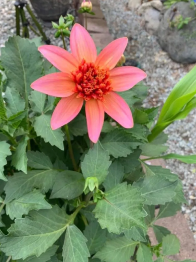 A soft orange anemone-type Dahlia with rust-orange centers, compact and ideal for gardens with edible petals for aesthetic appeal.