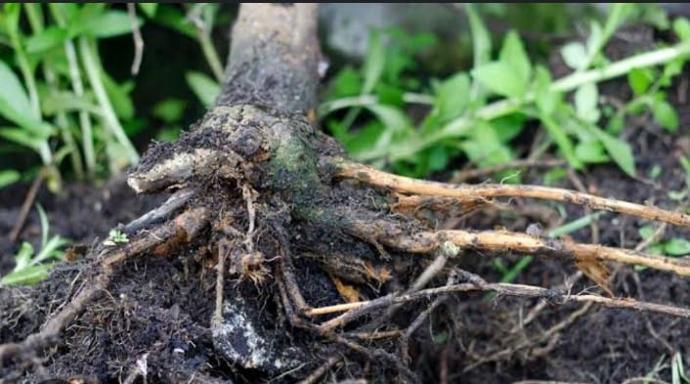 Roots appear to be swollen , decay or with excess water . Dark spots on the leaves .