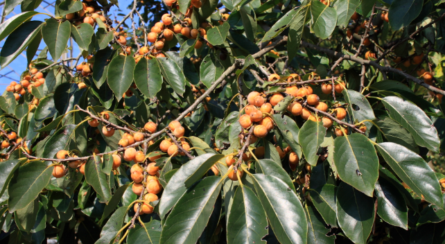 The persimmon tree (Diospyroshus) is a small deciduous tree that reaches a height of 15 to 30 meters. It has gray-green bark, glossy dark green leaves, and small oval flowers that bloom from June to July. When ripe, the fruit becomes a yellow berry 1 to 2 cm in diameter. The fruit has a sweet, rich taste and can be eaten raw, cooked, or dried like dates.