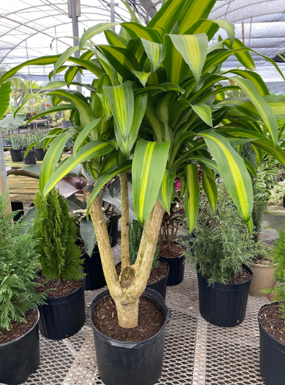 Mass Cane, a slow-growing corn plant, reaches 1.8-4.5 m indoors, with glossy green leaves and yellow central stripes, tolerates low light, known for air purification.