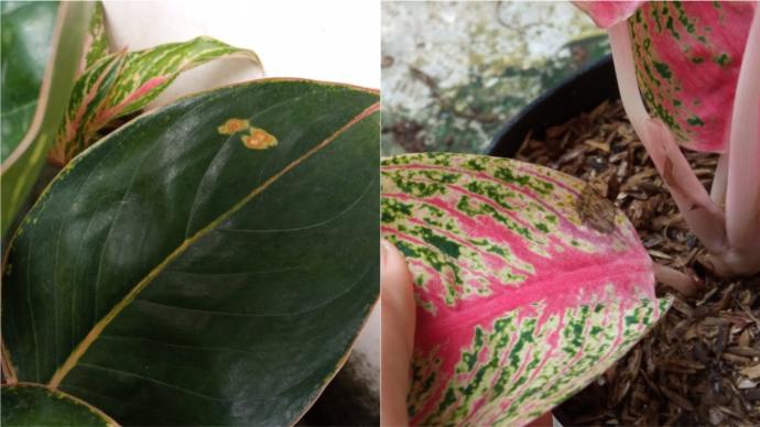 Yellow leaves, browning edges, sticky residue, fungal growth.