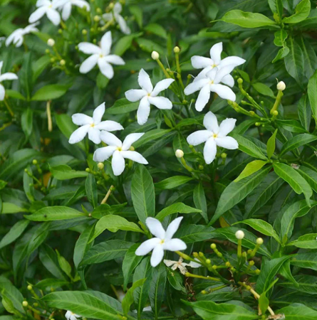 Dwarf Tagar (Tabernaemontana divaricata 'Nana'), a compact South Asian evergreen shrub, grows 0.6-1 m with slow to moderate growth in well-drained sandy-loam, prefers full sun to partial shade, requires moderate watering, is non-edible with sedative and anxiolytic benefits, and produces year-round white pinwheel flowers.