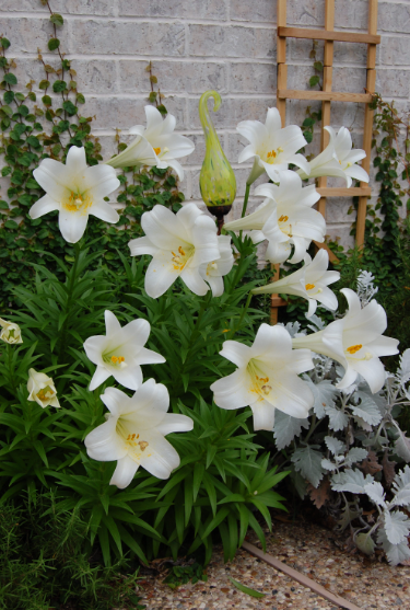 Easter Lily (Lilium longiflorum), a moderately growing perennial from Japan and Taiwan, reaches 0.5-1 m in sandy loam under full sun to part shade, producing 4-15 fragrant white flowers in July-August with no edible or medicinal properties.