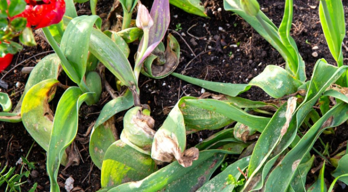 Gray mold on flowers and leaves, Yellowing, wilting leaves, stunted growth, Leaf spots, flower distortion, gray mold, Rotting at the base of the bulb, wilting Mottled leaves, stunted growth.