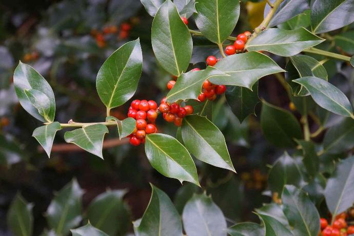 English Holly (Ilex aquifolium) is a tree/shrub that grows 15-50 ft tall, hardy in USDA Zones 6-9, prefers well-drained, acidic soil, full sun to part shade, medium to high moisture, edible berries, and has medicinal uses.
