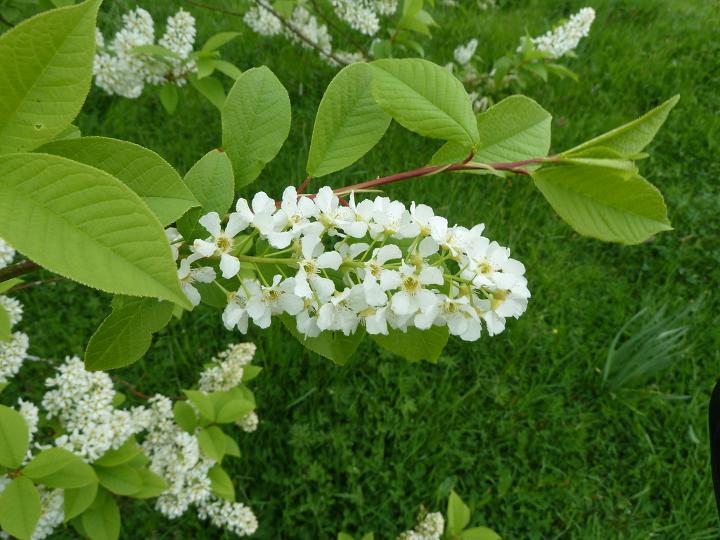 The European Bird Cherry (Prunus padus) is a species of cherry native to Europe and western Asia. It's a small deciduous tree or large shrub that typically grows in damp woods, along rivers, and in other moist habitats. It produces small, fragrant white flowers in spring, followed by black berries that birds often feed on, hence the name "bird cherry."