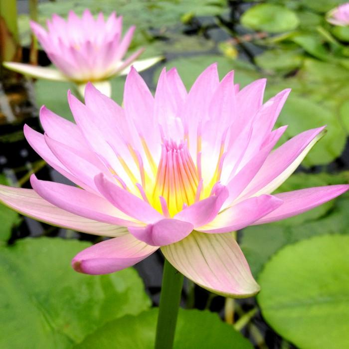 A dwarf lotus with soft pink, pearl-like blooms, ideal for small ponds with edible parts and elegant aesthetics.