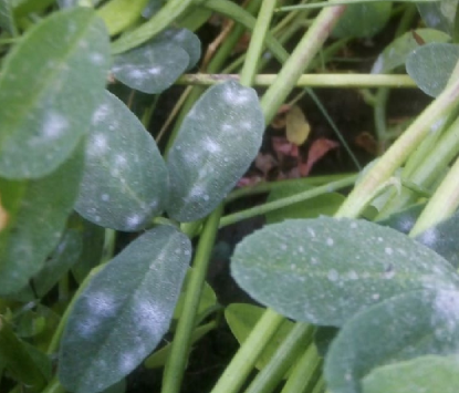 Wilting seedlings, white or gray fuzzy growth on soil, small water-soaked spots turning dark on leaves