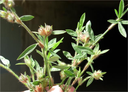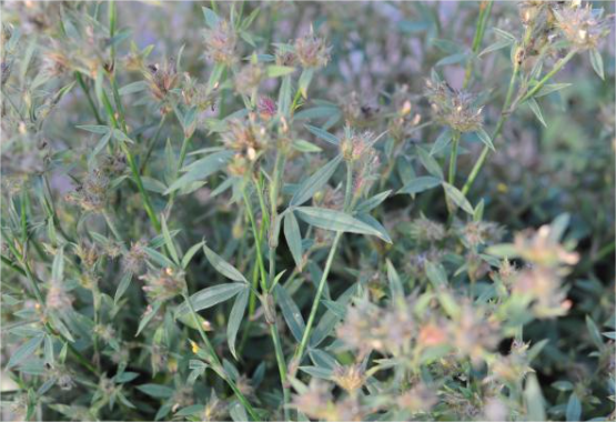 Fine-leaf Stylo (Stylosanthes guianensis) grows up to 3 ft, prefers well-drained soil, full sun, moderate moisture, and is neither edible nor medicinal.